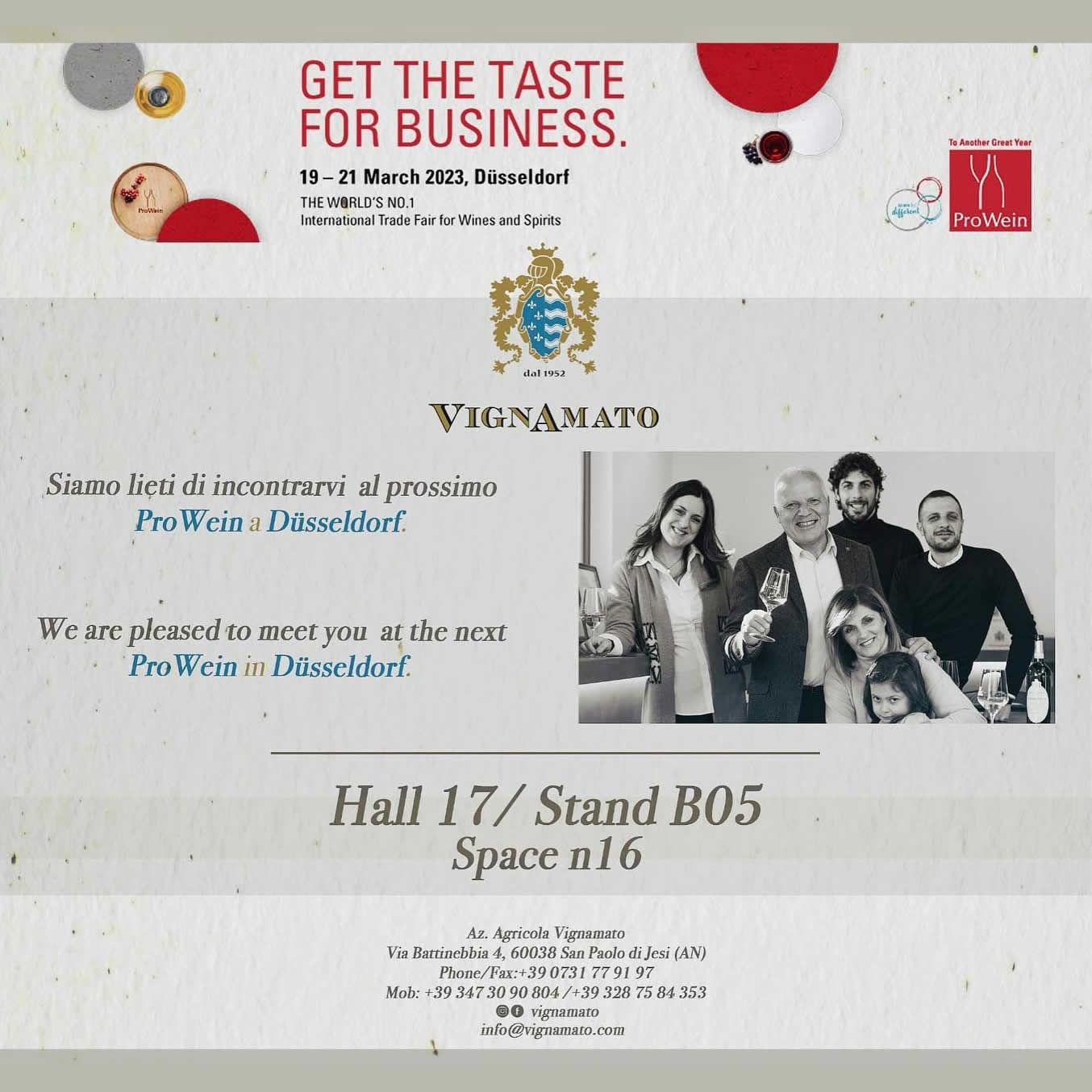 Da lunedì 19 Marzo saremo lieti di incontrarvi a Düsseldorf al “ProWein”, fiera leader a livello internazionale nel settore dei vini e dei distillati, nell’area della Regione Marche, per farvi conoscere i ns prodotti.